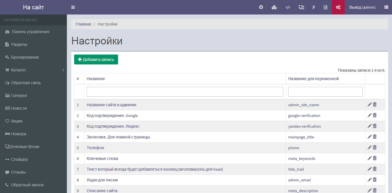 - "Название сайта в админке" – Текст, отображаемый в админке в верхнем левом углу.